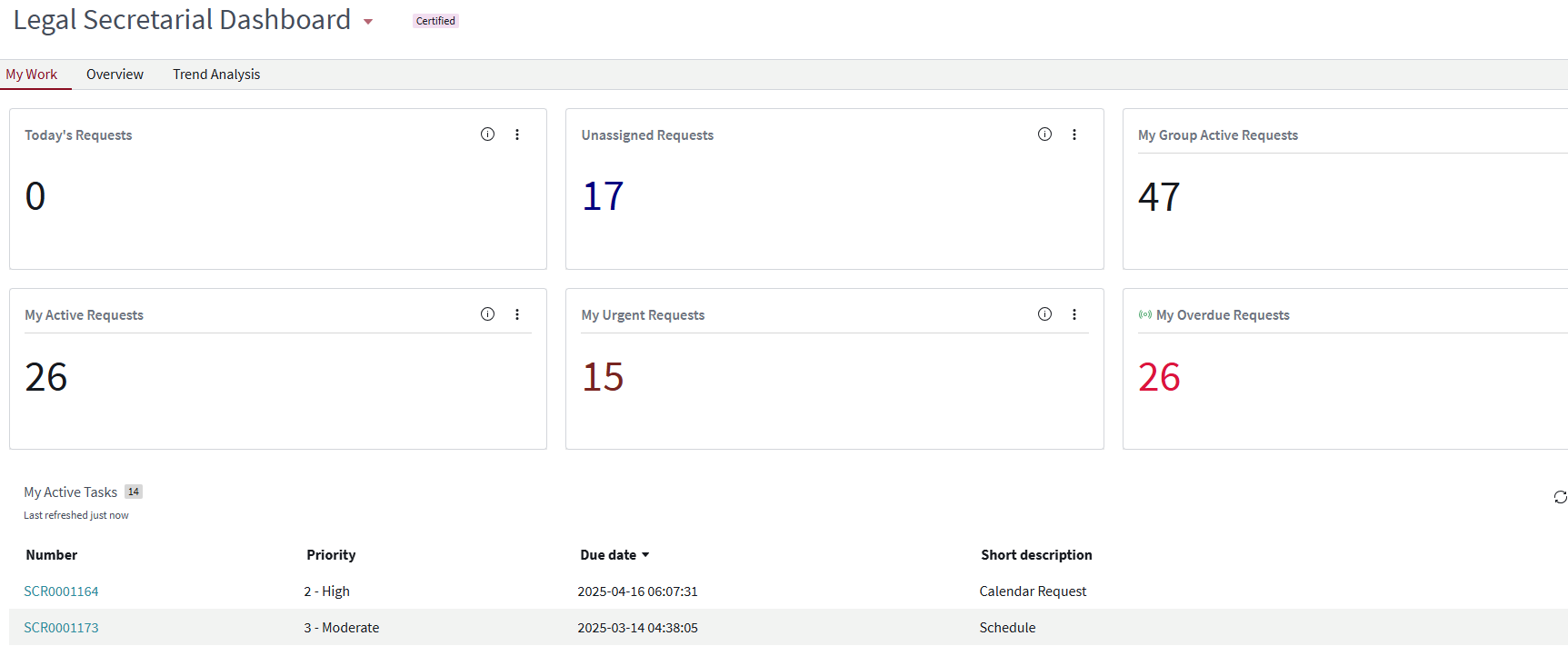 The real power lies in the dashboards. The "My Work" view gives each team member a clear picture of their urgent and overdue tasks, while the Overview tab provides leadership with insights into active requests across the entire team.