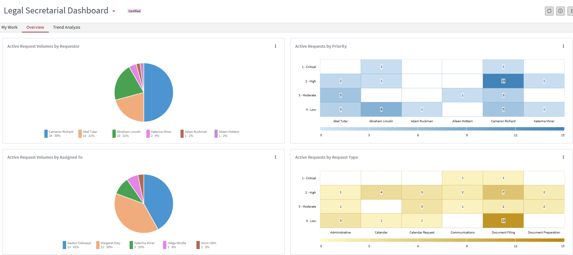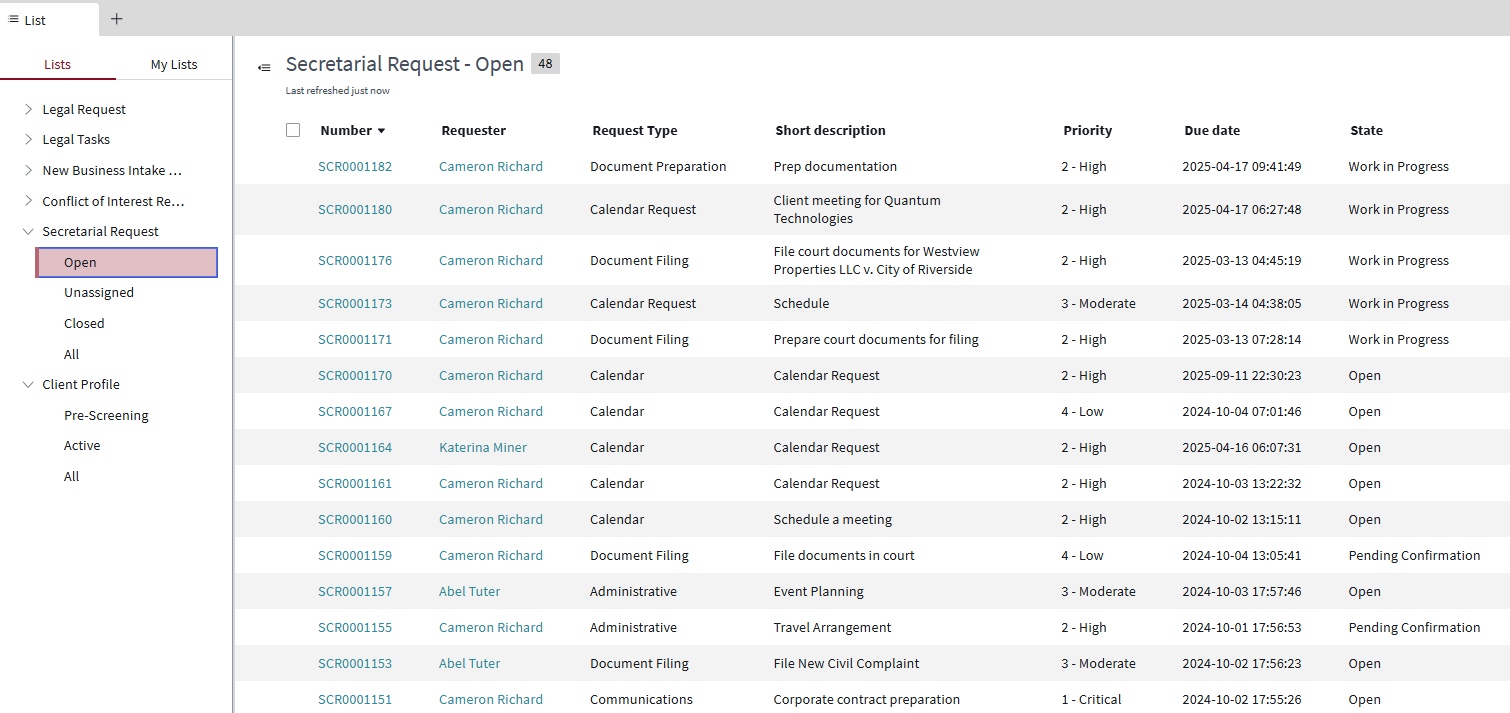 Legal secretaries can quickly identify new requests through intuitive list views, filtered by requestor, priority, due date, or request type. Need a custom view? The workspace personalization feature lets staff create their own filtered lists—no technical expertise required.
