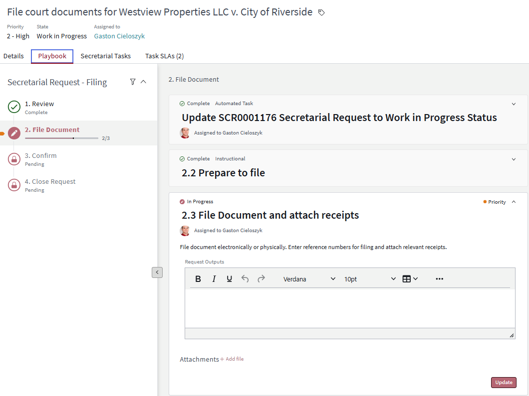 The platform's intelligent routing capabilities ensure requests land with the right person every time. Link partners with their preferred legal secretaries, and the system automatically assigns requests accordingly. For more complex workflows, built-in playbooks provide step-by-step guidance, complete with instructions and relevant knowledge articles.