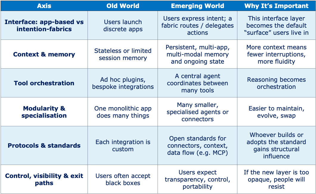 In this emerging world, apps become nodes on a substrate of intelligence; they aren’t islands you consciously switch between.